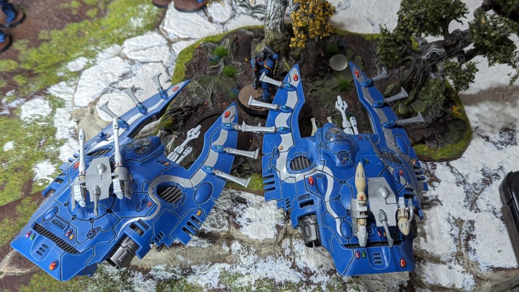 Die Ultramarines waren an Einheiten klar in der Überzahl, Geisterkrieger sind halt teuer. Deshalb habe ich diesmal konsequent versucht, mich in der ersten Runde auf die Einheiten zu konzentrieren, die meinem am ehesten gefährlich werden konnten. Das waren diesmal zum einen die Eliminatoren auf vorgeschobenem Posten im Wald, die mit ihren Lasergewehren gegen meine Transporter, zum anderen die Eradicatoren mit den Plasmawaffen auf der Anhöhe. Gleichzeitig wollte ich meine Einheiten so schnell wie möglich in die Nähe des Missionszieles bringen, denn Geisterkrieger sind nun mal langsam.
