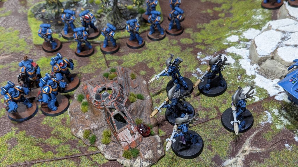 Während die Space Marine weiter vorrückten, war es an der Zeit für die Geisterkrieger, auszusteigen. Die Geisterwächter mit den Warpsensen bewegten sich in Reichweite des Missionsziels. Ydrir und die Geisterklingen wandten sich wie geplant den Schweren Intercessoren zu.