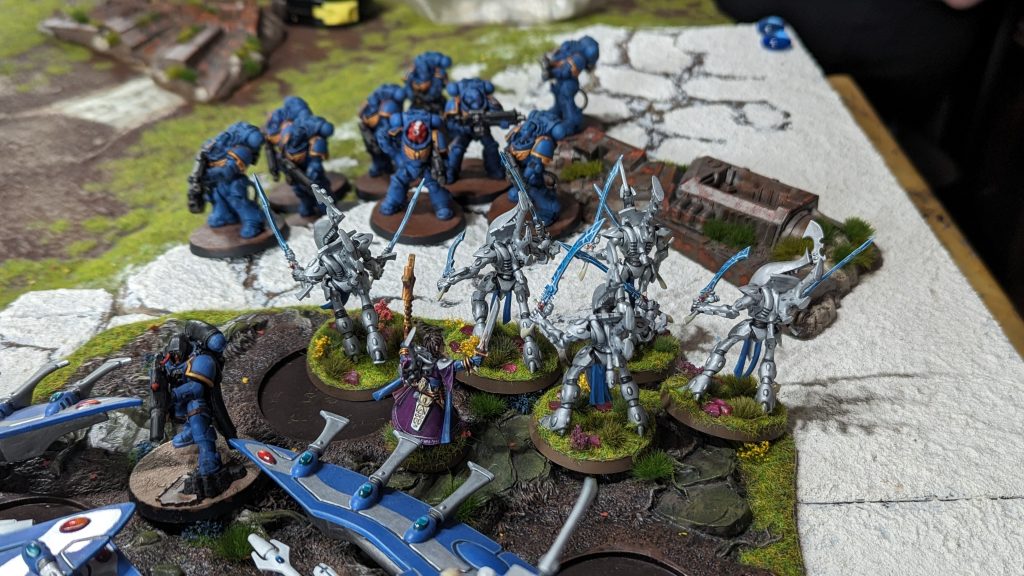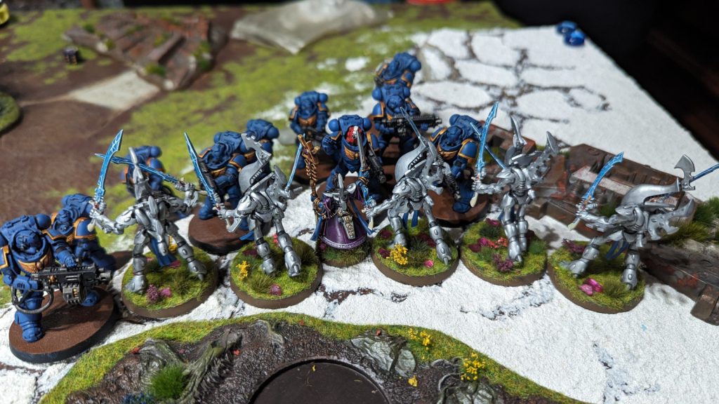 Auch die Geisterklingen hab ich noch nie eingesetzt. Auch sie habe sich bewährt. Der Trupp kommt auf fünf Attacken, die durch den angeschlossenen Geisterseher tödliche Verwundungen verursachen. Dadurch verloren die Intercessoren zwei Mann und konnten beim Zurückschlagen keinen Schaden anrichten. (Den zweiten Nahkampf mit dem einsamen Eliminator gegen die beiden Serpents hatten wir völlig vergessen.)