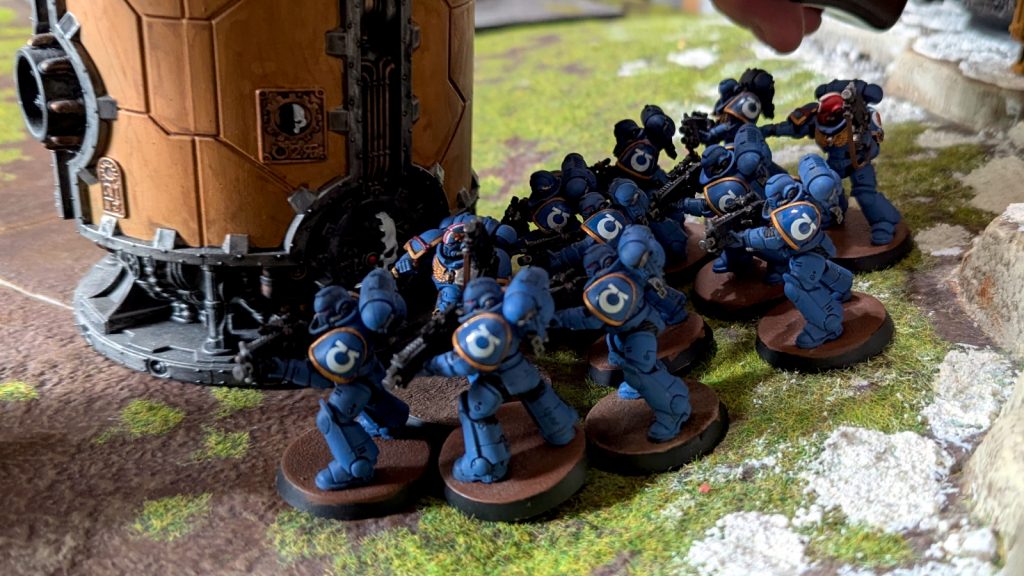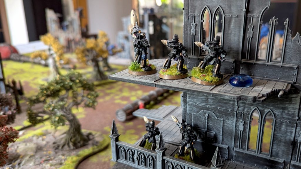 Als Antwort kam der Captain mit den Schweren Intercessoren zwischen dem mittleren und linken Gebäude hervor und nahmen die Rächer unter Feuer, so dass der Trupp sieben Modelle verlor.