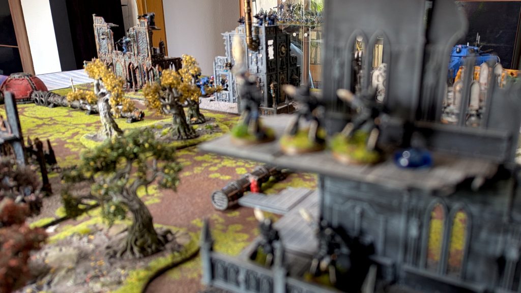 Die Rächer Asuryans mit dem angeschlossenen Autarchen rückten im Untergschoss vor, kamen aber selbst mit ihrer Kampftrance-Bewegung nicht nah genug heran, um ihren Shurikensturm nutzen zu können und anschließend im Nahkampf sicher vor gegnerischem Beschuss zu sein. Die Rächer verursachten bei den Intercessoren 11 Wunden und griffen dabei auf eine Gefechtsoption zurück, die ihnen [Deckung ignorieren] gibt. Trotzdem verloren die Space Marine nur ein Modell und 1 LP beim Lieutenant.