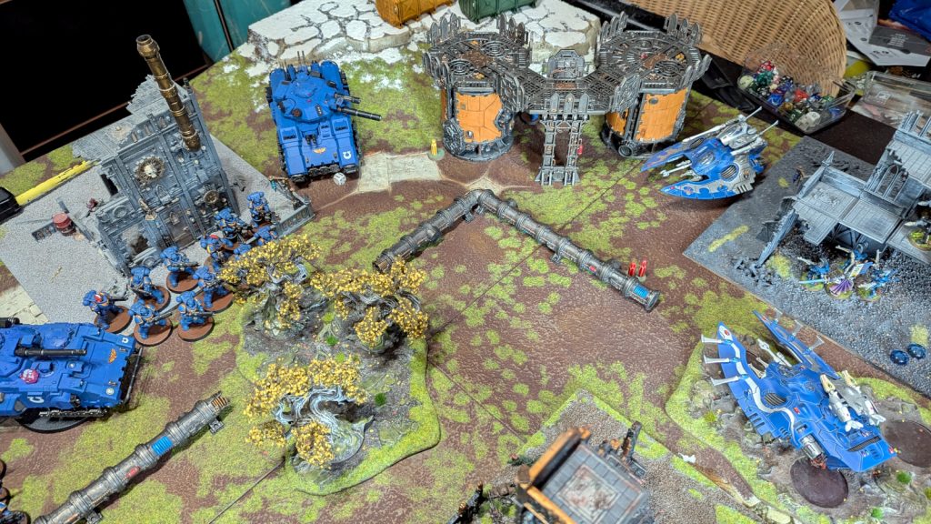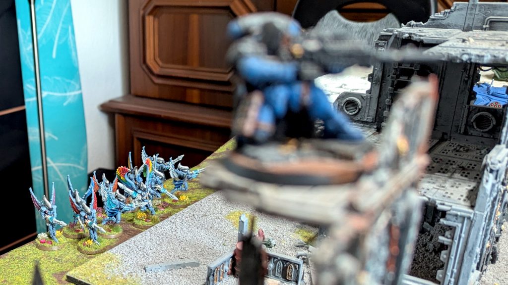 Die Falken schockten in die Aufstellungszone der Space Marines und teilten ihr Feuer auf. Fünf einschließlich des Exarchen schossen auf die Scharfschützen und holten einen weiteren raus, der letzte hatte nur noch einen LP. Die zweiten fünf erledigten einen weiteren Intercessor und nahmen einem zweiten 1 LP. Der letzte Scharfschütze schoss zurück und nahm einen Falken raus.