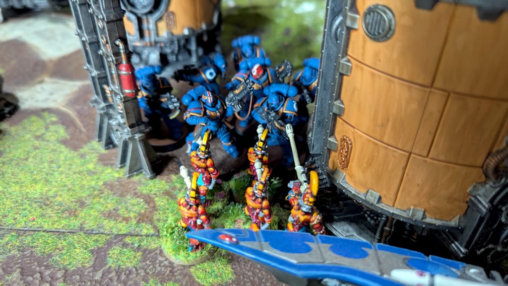 Als letzte Handlung in dem Zug stiegen die Feuerdrachen aus dem Falcon aus und beschossen den Intercessortrupp mit dem Bonus durch die Feuerunterstützung des Falcon. Obwohl sie tatsächlich eher gegen Fahrzeuge geeignet sind für die Melter-Regel nicht nah genug dran ware, gingen zwei weitere Space Marines. Der verbliebene Trupp entschloss sich dann, in den Nahkampf mit den Drachen zu gehen.* Das Abwehfeuer der Drachen erledigte dann einen weiteren. Dafür verloren die Feuerdrachen drei Krieger im Nahkampf.