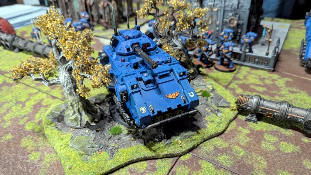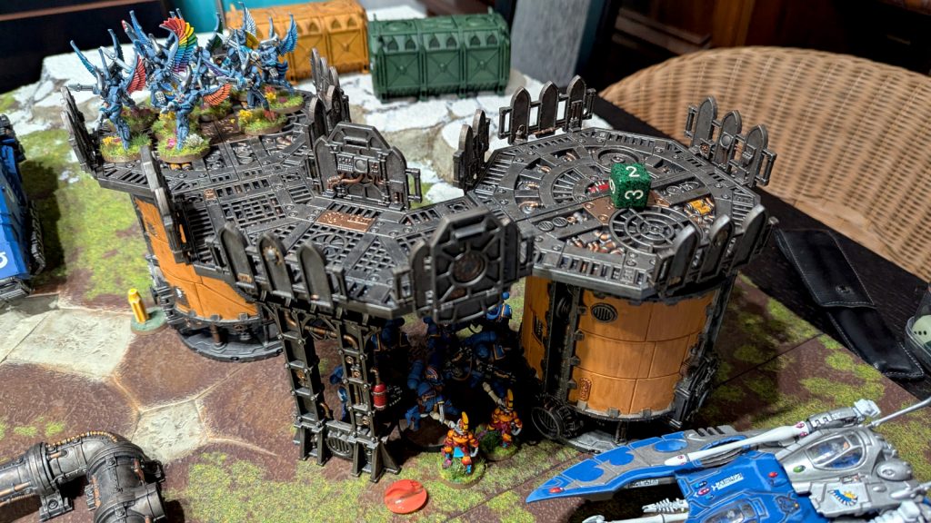 Als erste Aktion brachten sich die Falken in eine bessere Position auf der Plattform auf den Silos. Wärend sie flogen, ließen sie einen Granatenschauer auf die Intercessoren darunter regnen, richteten aber keinen Schaden an. Ihren Beschuss richteten sie auf die Schweren Intercessoren, nahmen ihnen aber nur einen LP ab.