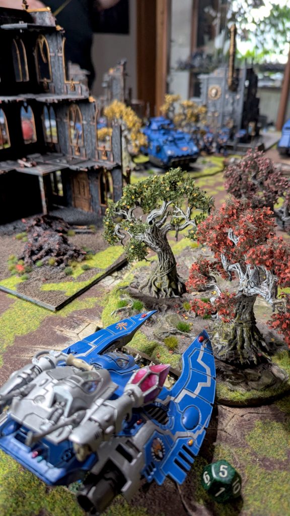 Der Executioner ließ den Serpent hochgehen, die Banshees kamen allerdings verlustfrei heraus. Allerdings fügte das explodierende Fahrzeug den umstehenden je 2 LP-Verluste zu. Dadurch gingen zwei Asuryans Rächer und die beiden verbliebenen Seelenschnitter, der Ilum Zar hatte nur noch 10 LP. Der weitere Beschuss nahm dann auch der Rächer-Exarchin einen ihrer beiden LP. Beim Ilum Zar allerdings ergaben beide Verwundungswürfe des Zerstörerlasers eine 1. Zwar gelang der Wiederholungswurf, doch auch der Schadenwurf ergab nur 1.