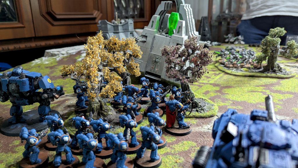 Während auf der linken Flanke die Geisterwächter zur Unterstützung der Weltenläufer vorrückten, ging der Schlagabtausch zwischen Necrons und Ultramarines weiter. Die Unsterblichen im Wald schossen auf den Captain, von fünf Verwundungen rüstete er vier. Der Dreadnought nahm den Trupp auf dem Dach des Bunker, die ein Missionsziel hielten, unter Feuer. Gattling und Sturmbolter holten zwei Necrons raus, die Plasmakanone einen weiteren. Der zweite Trupp Unsterbliche im Wald rückte vor und nahm die Intercessoren unter Feuer – durch die Kontingenstregel hatten ihre Waffen [Sturm] – töteten einen Space Marine und ließen einen mit einem LP zurück.