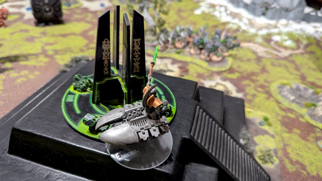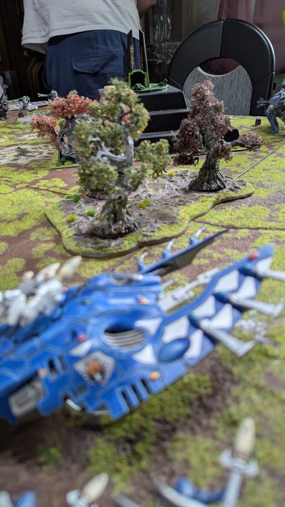 Der Serpent fuhr vor, um in er nächsten Runde seine Passagiere, Ydrir und die Geisterklingen absetzen zu können. Da er auf dieser Seite aber auch freie Schussbahn auf den Destructorlord hatte, verzichtete ich auf das Vorrücken. Der Serpent feuerte seinen Sternenschlag-Raketenwerfer auf den Lord ab, traf und verwundete. Der Schadenswurf war 6 – ein Instant-Kill.