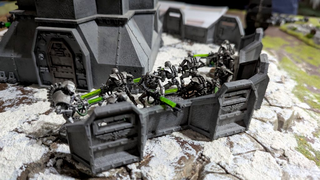 Rund um den Bunker ging der Schlagabtausch weiter. Der vordere Intercessortrupp streckte drei Unsterbliche im Wald nieder, der hintere drei. Ein schwerer Destruktor positionierte sich beim Missionszielmarker in der Aufstellungszone und zog dem Gladiator drei weitere LP ab. Die Unsterblichen hinter der Barrikade rückten vor, verursachten 24 Wunden bei den Intercessoren, was in zwei weiteren Verlusten resultierte. Der Captain rächte seinen Brüder, indem er aus dem aus nur noch drei Necrons bestehenden Trupp im Wald einen weiteren herausschoss. Der Unsterblichen-Trupp auf dem Bunker verursachte beim Dreadnought einen LP-Verlust, der zweite Destructor aus dem Hintergrund vier weitere.