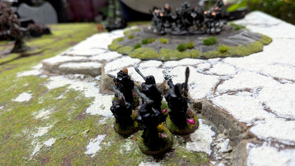 Nachdem der erste Wurf für den Spielbeginn ein Gleichstand mit 6en, holte ich beim zweiten Wurf die Initative für die Angreifer. Cynewulf und ich kamen überein, dass ich Anfange, um meine Weltenläufer zum Einsatz zu bringen. In den vergangenen Spielen waren sie meist abgeschossen worden, bevor sie irgendwas hätten machen können. Auch diesmal standen sie recht ungünstig mehr oder weniger offen, unterhalb der Hügelkante beim großen Krater. Immerhin hatten sie dadurch etwas Deckung. Aber immerhin hatten sie von da aus freies Schussfeld auch den Lord. Allerdings verursachten sie, trotz BF 2+, nur drei Treffer, davon 2 Wunden, die der Lord beide rüstete.